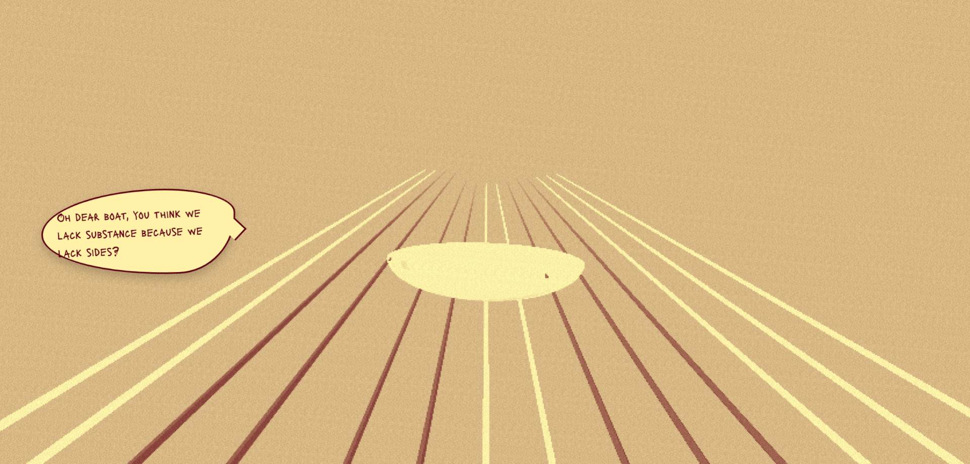 Unfold a philosophical dialogue between an abstract boat and its waves in this interactive 3D poem. Click to give voice to each character and watch the conversation come to life in a shifting, psychedelic dreamscape. This experience is a playable poem, an interactive diorama where you direct a conversation between two abstract characters. The story is told through their 14-part dialogue, which you reveal piece by piece. The Characters The Waves: A collective entity representing a two-dimensional, timeless existence. Their dialogue, which explores themes of repetition and the surface of things, is read in a higher-pitched synthesized voice. The Boat: A singular being defined by its three-dimensional volume and purpose. It carries memories and speaks of depth and direction in a deeper synthesized voice. How to Unfold the Dialogue Your role is to give voice to the characters and progress their philosophical exchange. The interaction is simple and sequential: Begin the Conversation: To start a new exchange, click on any of the white, horizontal wave lines. Each line represents a part of the dialogue. This action will prompt the Waves to speak their line, which appears in a speech bubble on the left. Await the Response: Listen as the Waves' dialogue is read aloud by the text-to-speech engine. Once they finish, the Boat will glow green, indicating it is ready to respond. Elicit the Reply: Click on the glowing green Boat to hear its part of the conversation. Its response will appear in a speech bubble on the right. Continue the Story: After the Boat has spoken, the scene will reset to a neutral state. You can then click another unused wave line (they turn dark after being used) to reveal the next part of their dialogue, until the entire 14-part story has been told.