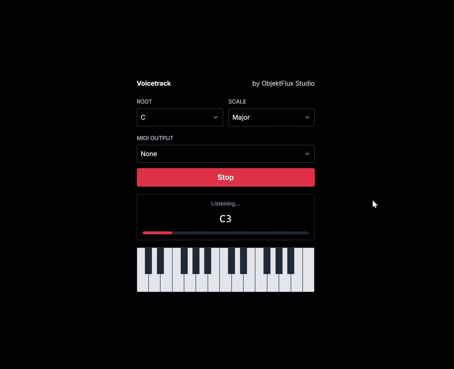 A web-based utility that converts your voice into MIDI notes in real-time, correcting your pitch to a chosen musical key and scale. Voicetrack is a minimalist yet powerful music production tool that transforms your voice into a MIDI controller. Designed for producers, musicians, and experimenters, this application listens to your vocal input, intelligently detects its pitch, and corrects it to the nearest note within your selected musical scale. The corrected note is then sent out as a standard MIDI signal. This allows you to play synthesizers, trigger samples in your Digital Audio Workstation (DAW), or control any MIDI-compatible hardware or software simply by singing or humming. The interface provides essential controls to set the Root Note and Scale (Major, Minor, Pentatonic, etc.), ensuring your vocal performance always stays perfectly in key. With an integrated piano display that visualizes the detected note and highlights the current scale, plus a real-time volume meter, Voicetrack offers instant visual feedback for a seamless creative workflow. How It Works Voicetrack simplifies the process of converting vocal ideas into musical data with a straightforward workflow: Configuration: The user first selects their desired musical key by choosing a Root Note and a Scale from the dropdown menus. MIDI Output: They then select an available MIDI output device from the list. The application uses the Web MIDI API to automatically detect connected hardware synths, virtual MIDI ports, or DAW inputs. Start Listening: Pressing the "Start" button activates the microphone. The browser will ask for permission to access the mic if it's the first time. Real-Time Analysis: The application uses the Web Audio API to continuously analyze the incoming audio stream. It calculates the fundamental frequency of the user's voice to determine its pitch. Pitch Correction & MIDI Conversion: The detected pitch is instantly "corrected" or snapped to the nearest note within the user-defined scale. This corrected note is then converted into a MIDI "Note On" message. When the user stops singing, a "Note Off" message is sent. Visualization and Output: The corrected note is displayed on the screen and highlighted on the virtual piano. Simultaneously, the MIDI message is sent to the selected output, playing the note on the connected instrument or software.